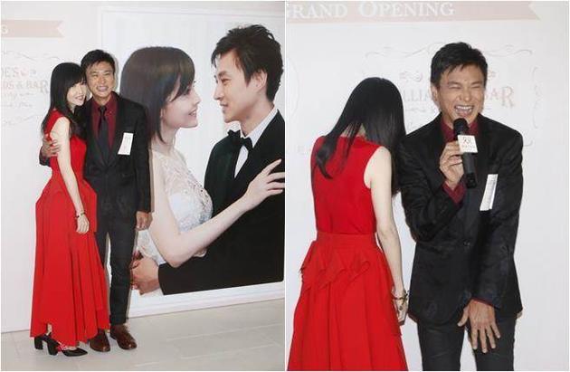 周慧敏身穿红衣斜肩长裙亮相,为老公倪震投资新店站台,两人也邀请好友古巨基当嘉宾,由于现场以周慧敏和倪震的婚纱照做为背板,古巨基则拱夫妻俩摆同样姿势,不过周慧敏和倪震很害羞,搭肩、对望时总忍不住笑场,最后小俩口则要求单纯合照。