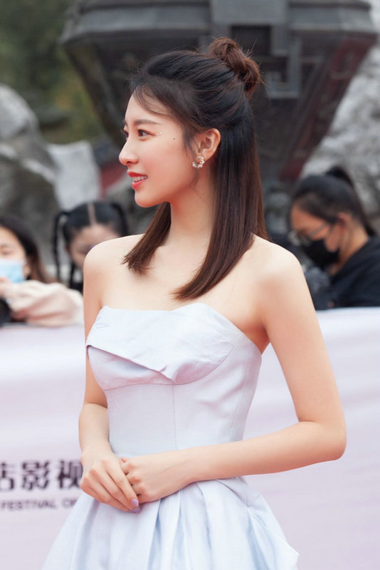 杜雨宸身着一袭冰蓝色抹胸长裙,简约大方的设计风格,搭配丝滑质感的布料,在光的照映下闪着高级光泽。加之杜雨宸本就高挑的身材与白皙的皮肤,尽显高贵典雅,整个人气场全开,气质满分。