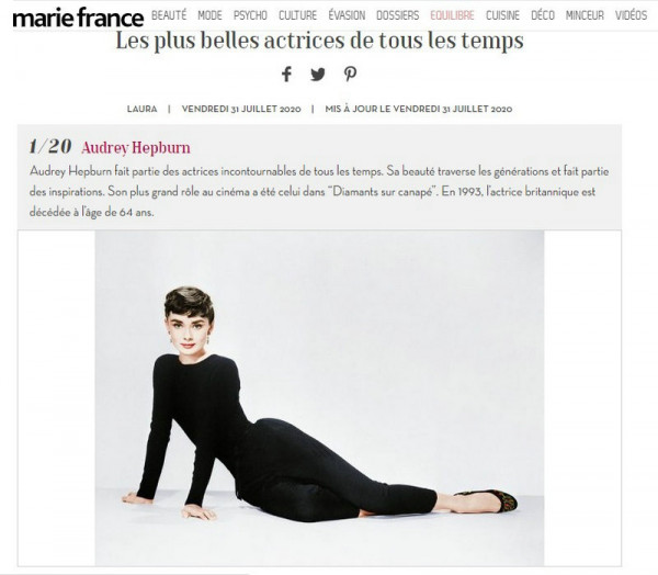 近日,法媒Marie france评选出“有史以来最美的20位女演员” ,章子怡位列其中。除章子怡外,其他入选的女演员有传奇女演员奥黛丽·赫本、玛丽莲·梦露等,年轻演员斯嘉丽·约翰逊、娜塔莉波特曼等人入选。