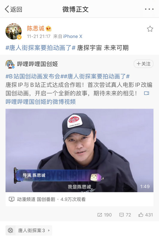 陈思诚公布《唐人街探案》将开发动画番剧落户B站
