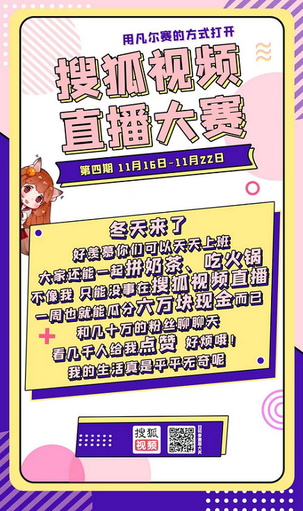 第四期搜狐视频直播大赛依然把“全民参与”的模式不断深化,可以让更多人更方便参与直播。通过瓜分奖金等方式促进用户输出更有特色、更多差异化的内容,充分体现搜狐视频打造价值直播平台的理念和决心。与此同时,搜狐视频将持续推进“全民直播大赛”,每期都将有特色直播主题供大家发挥,只要用户来搜狐视频APP开启直播,都将有机会赢得挑战奖金,并取得破圈热度。