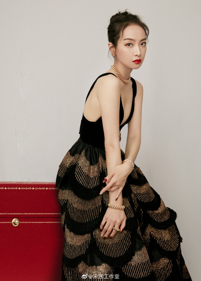 12月9日,宋茜工作室分享了三张写真照。照片中宋茜穿黑金配色深V礼服裙,戴一整套金色配饰,站在大型礼盒上,盘发造型十分优雅。