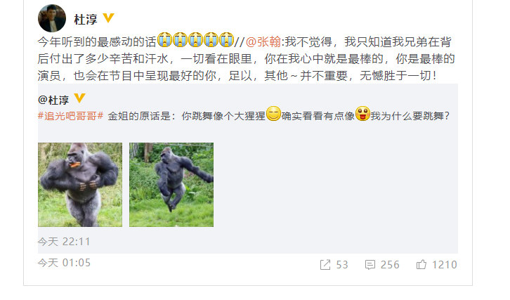 杜淳 在节目中唱跳《情人》,因身体不协调被网友吐槽,金星也点评他“唱的还行,但跳舞让我想起了老杜“。昨晚,杜淳配上大猩猩图发文调侃:“金姐的原话是:你跳舞像个大猩猩,确实看看有点像,我为什么要跳舞? ”随后,张翰也发文力挺杜淳:“我不觉得,我只知道我兄弟在背后付出了多少辛苦和汗水,一切看在眼里,你在我心中就是最棒的,你是最棒的演员,也会在节目中呈现最好的你,足以,其他~并不重要,无憾胜于一切!”