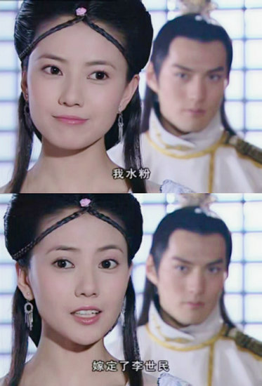 高圆圆的若惜公主小辫额饰从头发正中间以一个粉色小花为起点,向下至左右耳边延伸的两根小辫。虽说一打眼看起来有些奇怪,可是放在清纯系美人高圆圆头上,却又有了可爱任性的感觉,看久了还觉得非常漂亮。