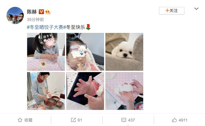 12月21日,陈赫在微博晒出全家一起包饺子的照片,说道:“冬至快乐”。照片中,陈赫的妈妈在包饺子,大女儿安安站在桌子旁,也认真地包着饺子,梳两个小辫子十分呆萌。小女儿则在一边玩面团,扎一个小小的朝天辫,吃着大家包的饺子,非常可爱。虽然陈赫用贴纸挡住了两个女儿的眼睛,但是仍可以看出两个孩子长得十分可爱。