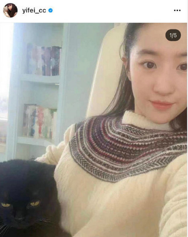 刘亦菲晒与爱猫自拍 素颜出镜皮肤状态佳