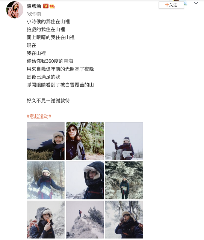 1月12日,陈意涵在微博晒出自己爬山的照片,说道:“小时候的我住在山里,拍戏的我住在山里,闭上眼睛的我住在山里,现在,我在山里,你给你我360度的云海,用来自几亿年前的光照亮了夜晚,然后已