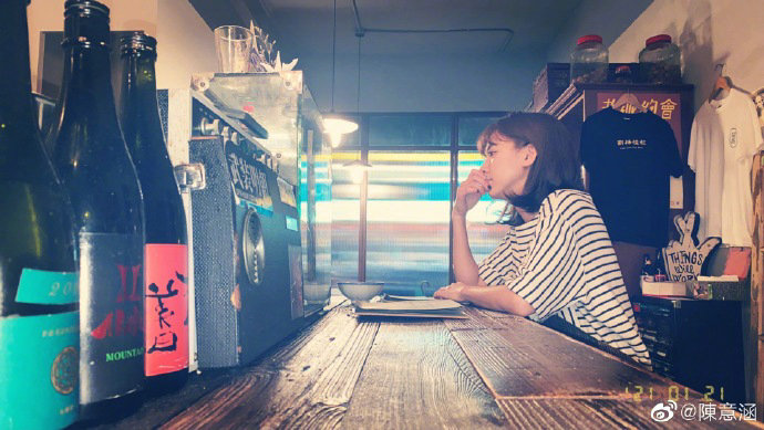 1月21日,陈意涵在微博晒出一组照片,说道:“5:30真的没人吃饭耶”。照片中餐厅内空荡荡的,陈意涵坐在桌子旁,穿黑白条纹上衣, 单手托脸,啃着自己的小拇指,十分可爱,空气刘海短发造型很有文艺气息。粉丝评论:“最近很爱这家店啊”,她回复道:“明眼人”。