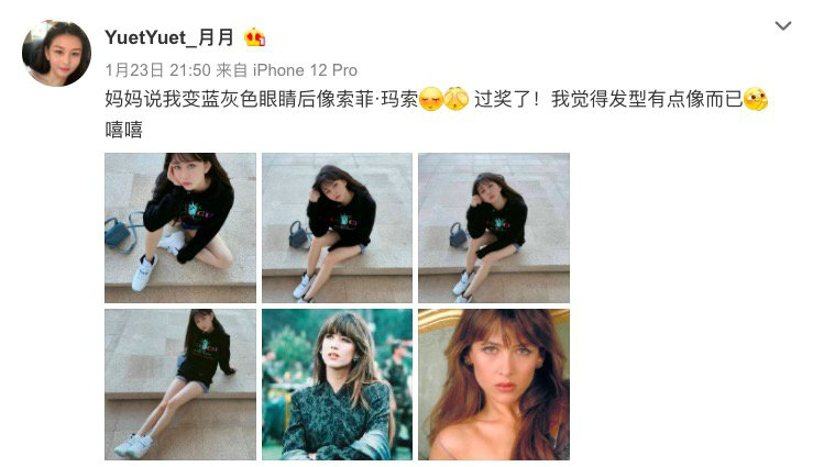 23日晚,邱淑贞女儿晒近照,配文:“妈妈说我变蓝灰色眼睛后像索菲·玛索,过奖了!我觉得发型有点像而已。”