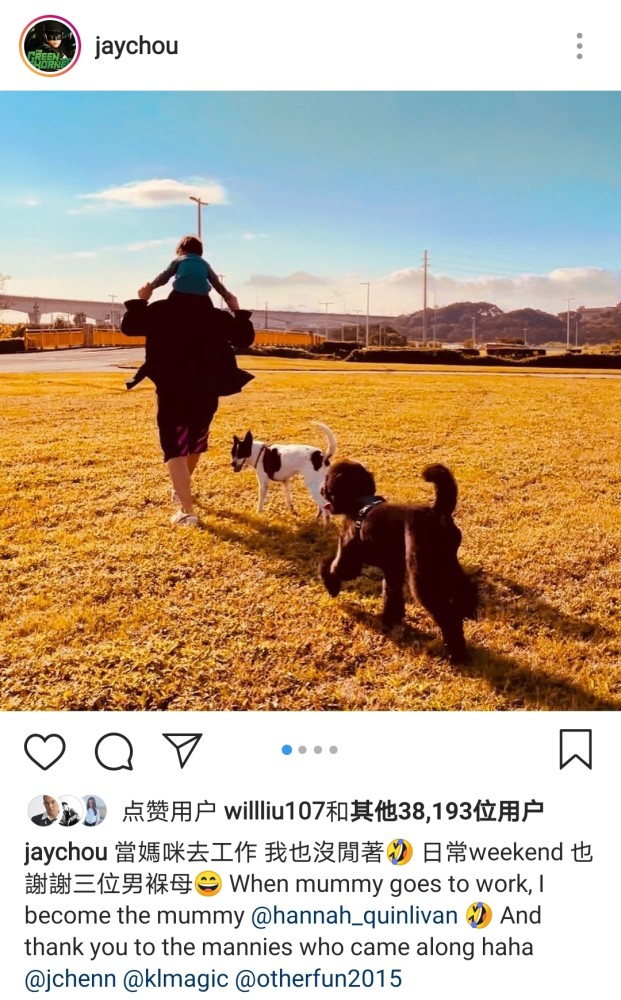 24日,周杰伦在个人社交网站上分享和一双儿女的周末日常,他幽默附文:当妈咪去工作,我也没闲着,日常weekend也谢谢三位男保姆!