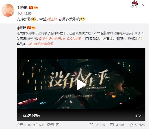 1月31日,毛晓彤转发汪峰新歌微博并配文:“支持新歌,希望汪峰老师多发歌哦”。