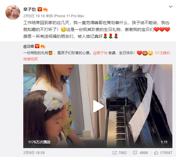 2月9日,汪峰在社交平台晒出两个女儿弹琴为章子怡庆生的视频。并配文道:“一份特别的礼物,是孩子们珍贵的心意。老婆,生日快乐!”