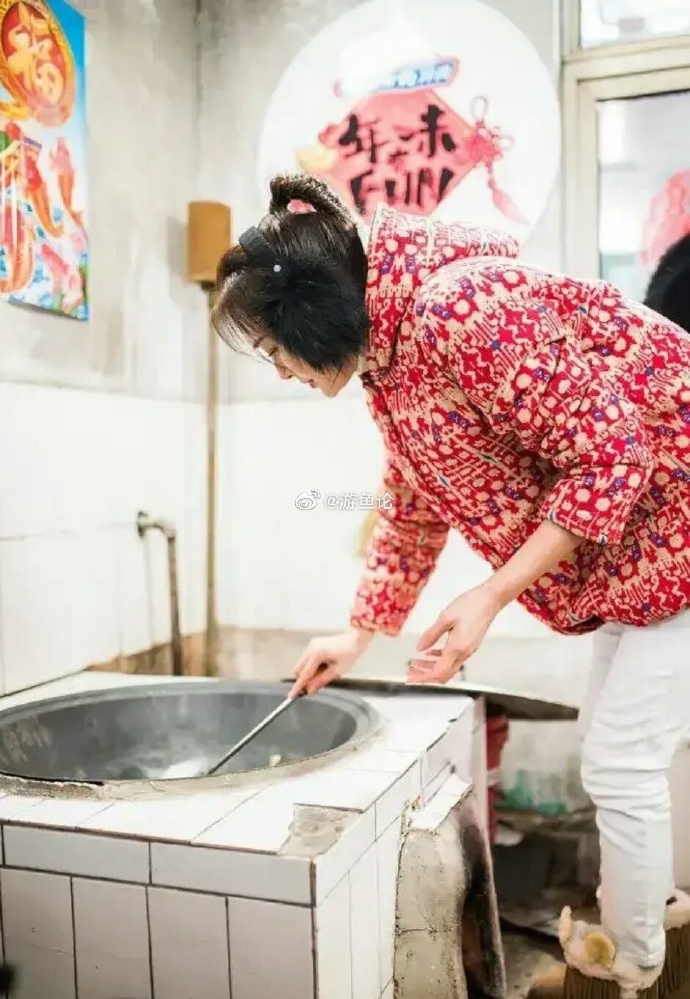 秦岚回老家干活,穿大花棉袄成“村花”