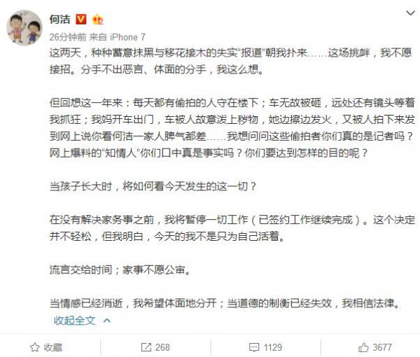 这两天,种种蓄意抹黑与移花接木的失实“报道”朝我扑来……这场挑衅,我不愿接招。分手不出恶言、体面的分手,我这么想。