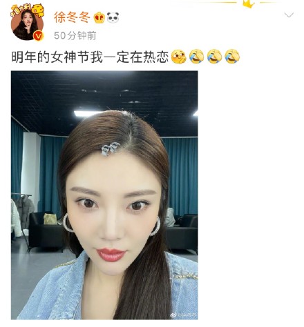 徐冬冬晒出女神节自拍,皮肤状态超好,并配文称:“明年的女神节我一定在热恋”。网友们留言称:“能不能跟我说一下?你想要找什么样子的?”“你是不