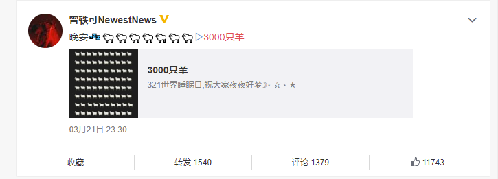 世界睡眠日,曾轶可宠粉在线营业:晚安,3000只羊!