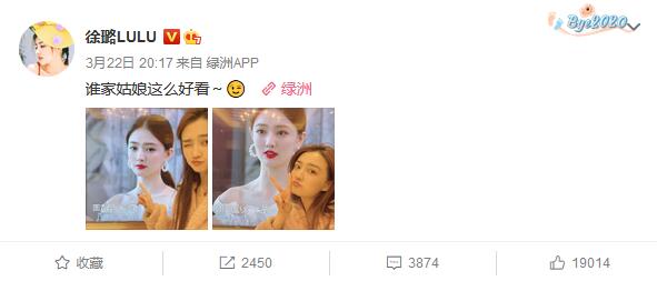 3月22日,徐璐在社交平台上晒出一组与自己同框的照片,嘟嘴比耶表情十分可爱。她配文称:“谁家姑娘这么好看~”,言语间尽显调皮可爱。