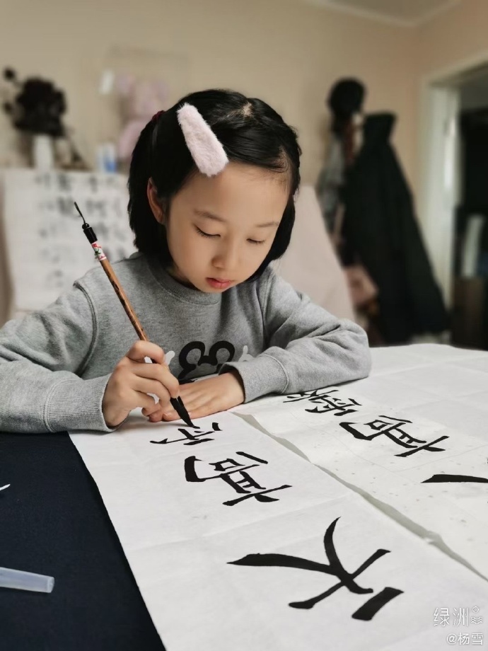 3月26日,杨雪在社交平台晒出一组写书法的照片,并配文称:“好字,中国娃要写好中国字,少年强则国强!”。