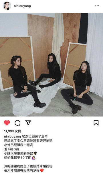 欧阳妮妮晒三姐妹合照 穿同款黑T黑牛仔时髦又养眼