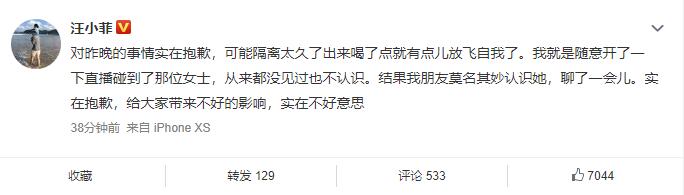 4月12日,汪小菲在社交平台发文表示自己不该酒后直播,并且表示自己并不认识连麦的女主播,他写道:“吃对昨晚的事情实在抱歉,可能隔离太久了出来喝了点就有点儿放飞自我了。我就是随意开了一下直播