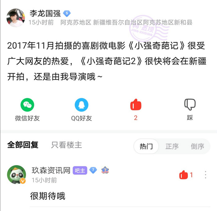 近日,喜剧微电影《小强奇葩记》导演李龙国强在某平台发文称《小强奇葩记2》可能在新疆开拍。