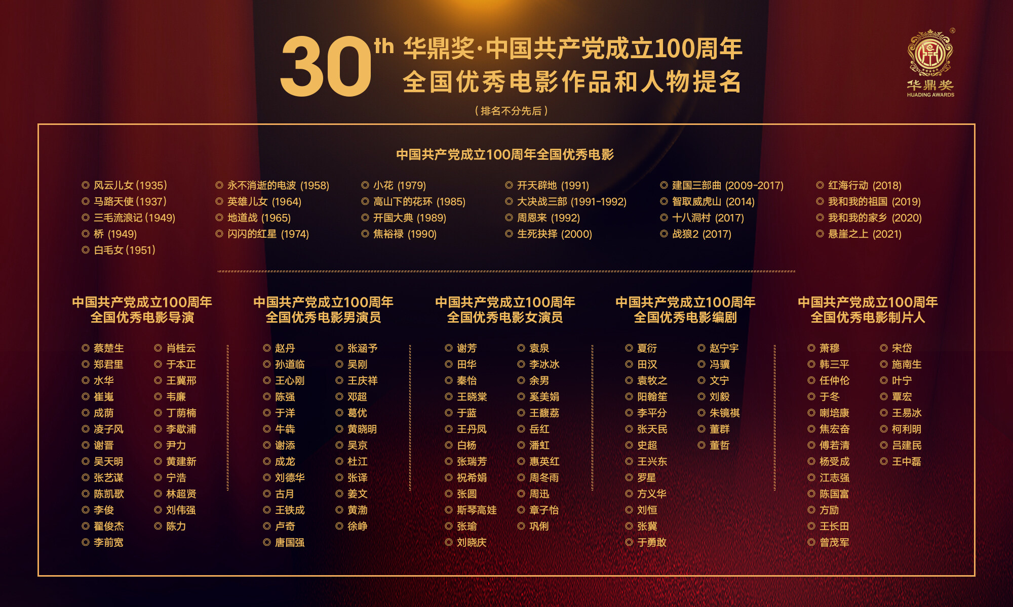 5月21日,华鼎奖集团在澳门公布了第30届华鼎奖·中国共产党成立100周年全国优秀电影作品和人物提名名单,《风云儿女》《白毛女》《地道战》《高山下的花环》《开国大典》《生死抉择》《战狼2》《我和我的祖国》《悬崖之上》等25部不同年代的主旋律佳作获得提名,赵丹、王心刚、吴京、张涵予、谢芳、田华、巩俐、周冬雨等50位优秀男女演员入围。