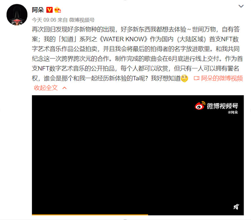 5月25日,苗族鼓舞武术鼓非遗传承人、新民族音乐发起人、创作歌手阿朵在个人微博公开发布了新作《WATER KNOW》的demo视频,据阿朵介绍,《WATER KNOW》是她「知道」系列的首支作品,也是国内首支NFT数字艺术音乐作品,全曲通过蚂蚁链技术对歌曲进行加密,此次她还将封面和歌曲的署名权进行公益拍卖,拍卖所得拍款将用于壹基金壹乐园音乐教室项目的捐赠。此次把数字音乐、区块链技术、公益结合到一起,对于传统的音乐发行也是一次新的突破,阿朵可谓敢于尝试,成为了大陆区域“第一个吃螃蟹的人”。