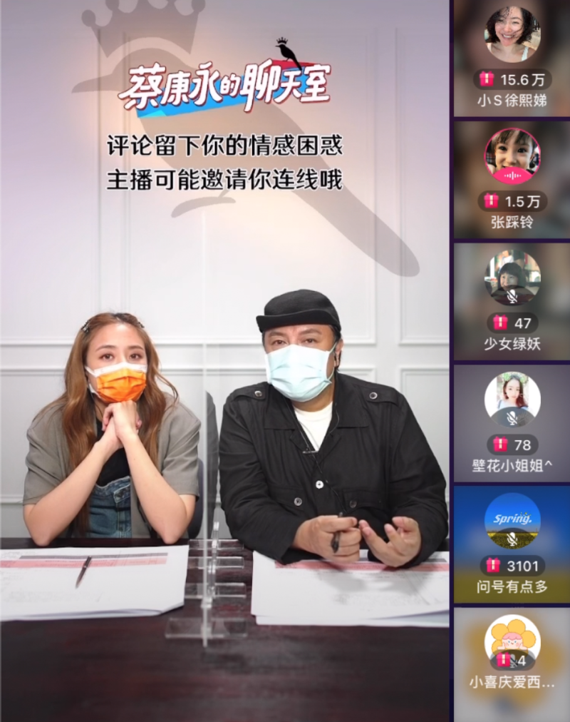 第一次出现在抖音直播,蔡康永并没有选择大多数明星首选的带货直播,也没有选择全程展现自我艺能的秀场直播,而是选择了与好友小S、鬼鬼吴映洁等嘉宾,以及众多粉丝可以同时加入、表达观点的聊天室直播。