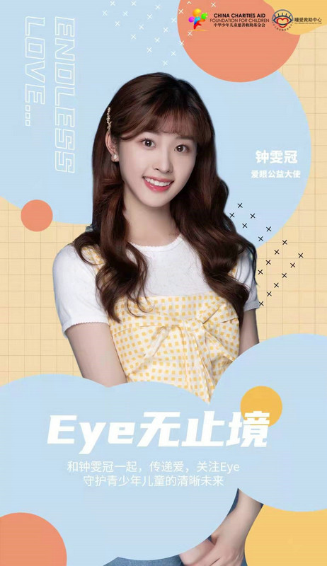 在“66全国爱眼日”及全国爱眼月活动中,热心公益活动和充满正能量的00后新生代演员钟雯冠,被活动主办方之一的中华少年儿童慈善基金会选中,作为“爱眼公益大使”,呼吁大家一起传递爱,关注eye,关注青少年儿童视力、一同守护乡村儿童的清晰未来。