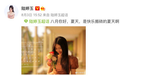 近日,丝芭影视演员陆婷玉在社交平台上配图发文“八月你好,夏天,是快乐搬砖的夏天啊。”配图上穿着泡泡袖的她,两只手拿着鲜花,低头笑着,少女感满满。旁边还有手写体的八月日历,预示着她依旧繁忙“搬砖”的八月。近期陆婷玉一直在横店拍摄古装仙侠剧《花戎》,期间所分享的个人照片不免涉及到角色造型泄漏的问题,有趣的是一直被粉丝调皮喊作“剪辑鬼才”的陆婷玉,在防剧透上也延续了她的小巧思,升级为“P 图鬼才”。