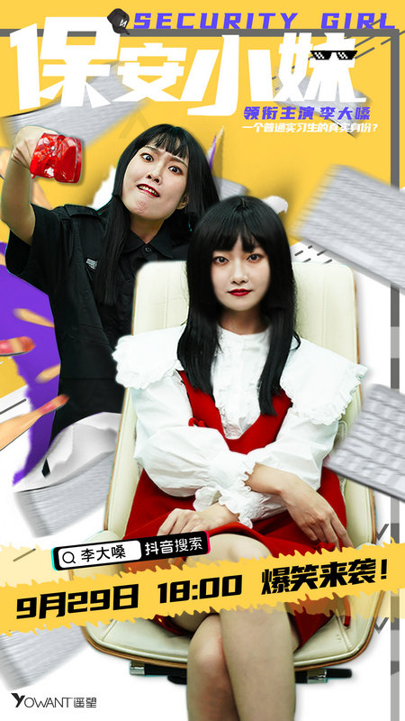 《保安小妹》主海报由抖音短剧、杭州遥望网络科技有限公司联合出品,张兵、吴怡雯担任制片人,邹亦成担任导演,魏佳雯担任编剧,短视频剧情达人李大嗓主演的爆笑穿越奇幻短剧《保安小妹》将于今日在抖音独家上线。故