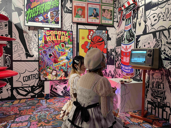 末那末匠的狐狸先生珍宝馆里充斥着蒸汽朋克元素,可怜招待所则以日式拉面店的形式,展出独特风格的玩具。多元艺术家、独立音乐人静电场朔的音像店里既能听到“静电式”的电子音乐,也能欣赏到艺术家画作和雕塑。而在创可贴8的专属区域里,在这个厂牌标志性的不倒翁雕塑旁边,你可以在上世纪70、80年代富裕家庭的象征-9寸黑白电视上尝试一下曾经称霸儿童届的小霸王游戏机,在舞池里迷幻闪耀的灯球以及夺目的霓虹灯的照耀下,重温或畅想一下昔日的时尚。空间里的所有元素都仿佛是一个隐喻,不受控制的京味儿波普精神穿越时空。如果为了拍照打卡,JOYIDEA的抱抱熊以及PEPPERJERRY的拍照亭都是不二选择。