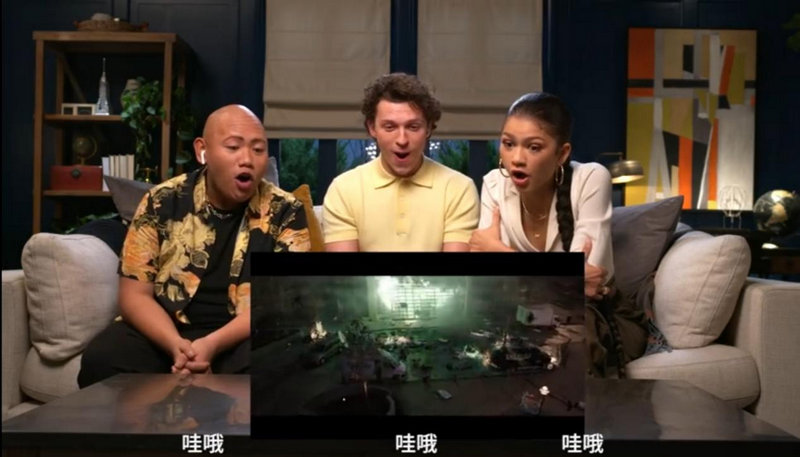 《蜘蛛侠:英雄无归》主演荷兰弟、赞达亚、雅各布一同观看预告片,三人兴高采烈,互动连连,非常有梗。看到飞跃时代广场的高空戏份时,赞达亚对荷兰弟打趣道:“你当时不小心倒在我的怀里,到底谁才是蜘蛛侠?”经典宿敌现身时集体惊呼,并说“观众看到一定会发疯的!”看到三人组同框画面时,更是评论道“我们太好看了,爱了!”三人盛赞蜘蛛侠战服非常炫酷、赞达亚和雅各布开心到握手、荷兰弟在看到蜘蛛侠说“我无法拯救所有人”时激动表示“你可以的!”全员激动不已,妙趣横生。