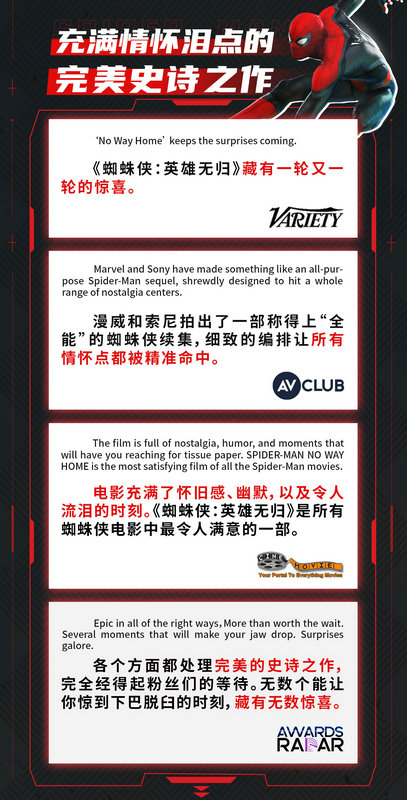 作为2021年最受期待的漫威超级英雄巨制,《蜘蛛侠:英雄无归》上映后口碑也再创历史新高,烂番茄开局100%新鲜度,100%爆米花指数登顶年度最佳,IMDb 9.1成为目前影史最高分超级英雄电影,并荣登最好250部电影第8名、MTC 72同样年度绝佳,CinemaScore 获A+荣誉,成为蜘蛛侠真人电影有史以来最好评价。普通观众看完后好评如潮,专业媒体、影评人也同样赞不绝口。行业媒体Deadline狂赞“这不仅是最棒的蜘蛛侠电影,也是2021年的最佳电影之一。”而Fandango则表示影片“从头到尾都充满惊喜。这是一部必须在大银幕观看的史诗级蜘蛛侠电影。”除此之外,演员的表现也大获肯定:“汤姆·赫兰德在《蜘蛛侠:英雄无归》中带来迄今为止最佳的表演”。还有媒体称赞:“导演乔·沃茨创造了一个奇迹,他将跌宕起伏的剧情、幽默、动作和情感元素融为一体。”影片故事、表演、情感、画面得到全方位的肯定,超高口碑点燃了全球无数观众的期待。