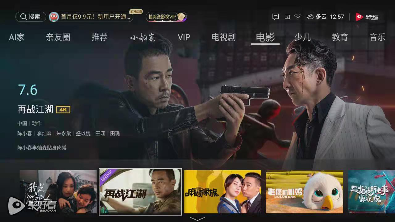 海信电视搭载的聚好看平台,汇集了海量高分剧集和口碑佳片以及综艺、音乐、教育、K歌等丰富的点播内容(节目根据电视机型有所区别)。电影《再战江湖》将在聚好看全网首播,让我们跟随陈小春、李灿森两位山鸡哥,重回江湖、再战一场!