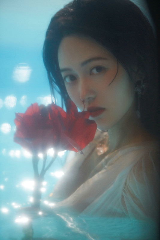 陆婷玉的出水芙蓉大片载着纯欲与优雅在蓝色氛围中碰撞,身穿一袭梦幻薄纱裙,尽显曼妙曲线,肤白胜雪,面若桃花。白衣曼纱在水的包裹下自带柔光效果,熠熠生辉。手拿娇艳欲滴的红玫瑰,和花低声絮语,柔如水,美如画。