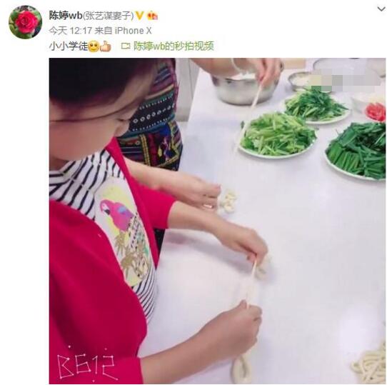 12月16日,张艺谋太太陈婷微博更新一则小女儿张一娇学做面的视频。在视频中,张一娇先是把面团在桌子滚一滚,然后再轻轻拉长,看起来有模有样。不知道是不是在做爸爸家乡的美食棍棍面。