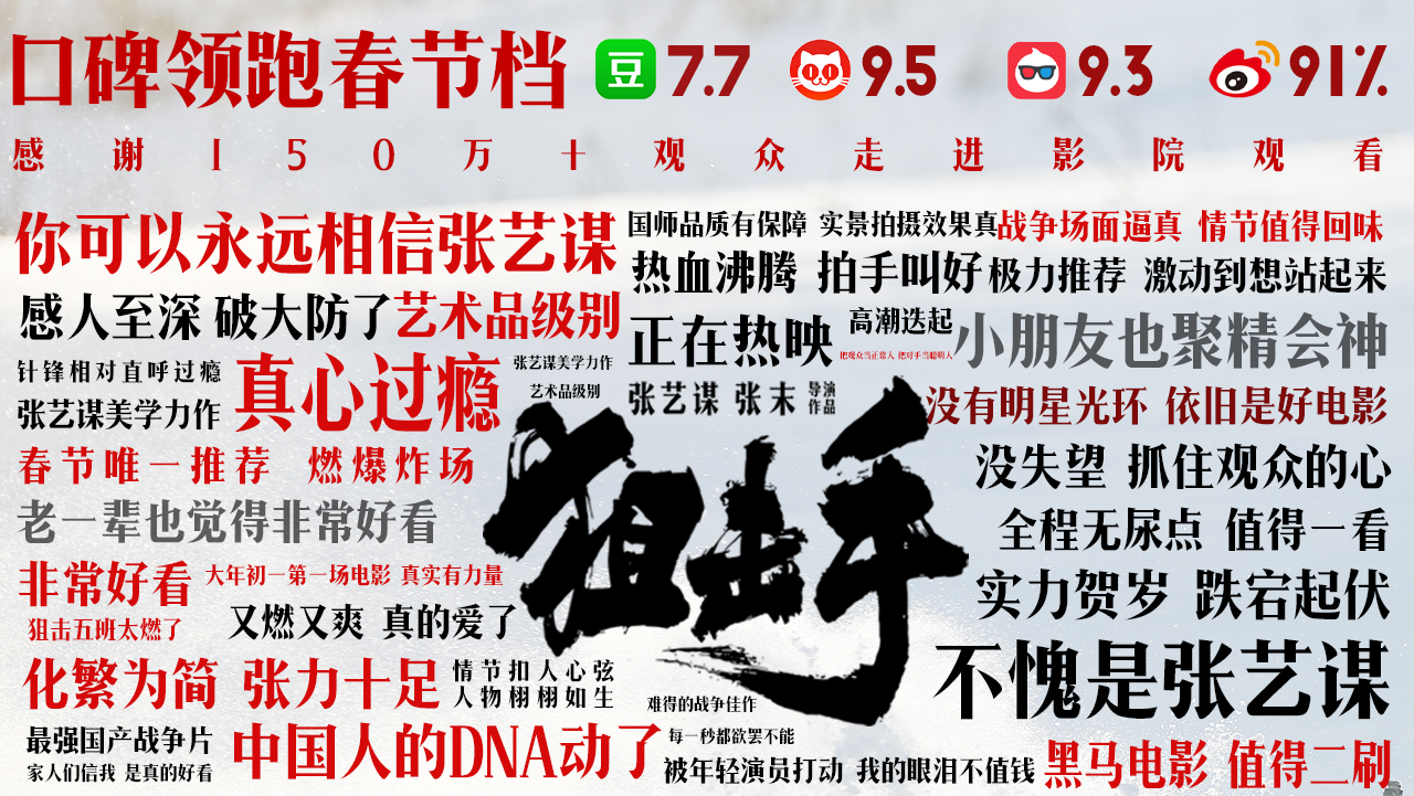 张艺谋春节档电影《狙击手》已于大年初一正式上映,猫眼、淘票票开分9.5分口碑爆棚,豆瓣7.7分位居同档期评分第一领跑春节档。影片近日发布口碑特辑,真实好评如潮,无数观众在观影过程中沉浸于志愿军战士与美军狙击精英小队的殊死对决中“几乎忘记了呼吸”,更被每一个鲜活的战士展现的无私奉献与牺牲精神感动到热泪盈眶,盛赞影片“非常激动,一直含着泪看的”,“针锋相对直呼过瘾,每一秒都欲罢不能”,“ 有笑点有泪点,就是没尿点”,“太好看了,简直是春节档之光”。不少观众也成为影片“自来水”,甚至自发为影片包场表示好运品值得被看到,超高话题讨论度和过硬质量也让电影《狙击手》成为春节档影片的口碑首选。