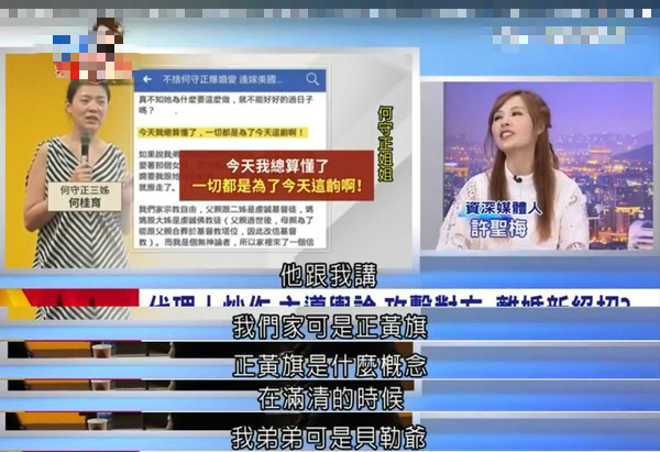 据台湾媒体报道,小娴、何守正婚变一事延烧多日,双方各说各话,亲友也纷纷跳出互相开呛、喊话,名嘴许圣梅15日就在节目上替女方打抱不平,并透露过去自己与何守正姐姐交涉的过程中,对方曾经撂话,“我们家可是正黄旗”,指弟弟是贝勒爷,因此许圣梅指出何家非常注重血统,不可能接受领养的小孩。