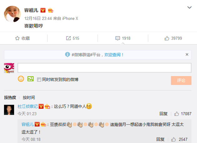 容祖儿微博告白嗯哼 杜江评论互动称是同道中人