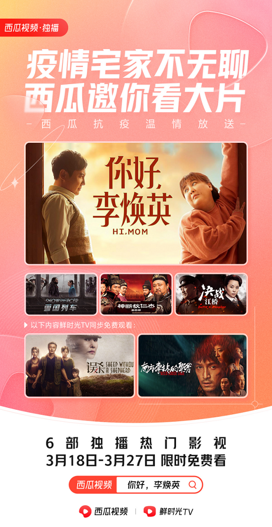 西瓜视频宣布,为充实用户的居家时光,3月18日至3月27日,将开启《你好,李焕英》《误杀》《南方车站的聚会》《雪国列车》等六部精彩影视作品的免费独播。其中,《误杀》《南方车站的聚会》两部影片,也将在鲜时光TV同步免费开放。