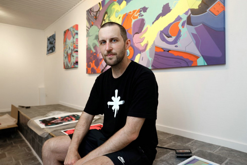 Emil Ohluand的画面里没有厚重、繁杂的装饰,乍看之下仿佛是喷绘而成,其实则是由艺术家用传统的笔刷完成的。但同时,Emil刻意的隐去了他的笔触,期望使画作达到“超扁平”的特殊效果,让他的画作更具有视觉冲击力。在Emil的作品中还往往出现骷髅战士的形象,这是因为他想创作出一个能代表80-90年代的流行文化缩影。酷似EVA初号机的配色、无处不在的乐高砖块,这些艺术家童年的记忆通过画作外化,组成了一个可以短暂逃离现实的维度。