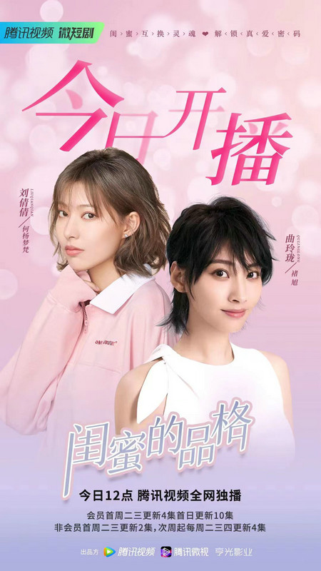 《闺蜜的品格》将于4月12日起在腾讯视频全网独播,会员每周二周三更新4集,首更10集,非会员首周二三更新2集,次周起每周二三四更新4集。让我们共同期待,与剧中人物一同开启“变形记”,寻找换位人生中爱情与人生的答案。
