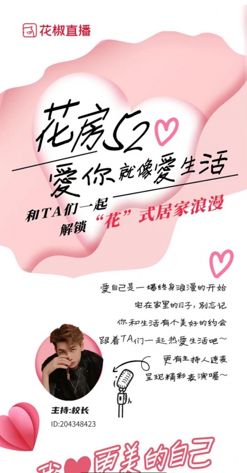 “用科技连接彼此,让陪伴传递美好”,在520这个表达爱意的日子,花房集团特别发起“花房520,爱你就像爱生活”大型专题直播活动,花椒直播、六间房联合站内数十家公会、近五十位主播以百场直播邀请网友一键直达美好,共同解锁“花”式居家浪漫。