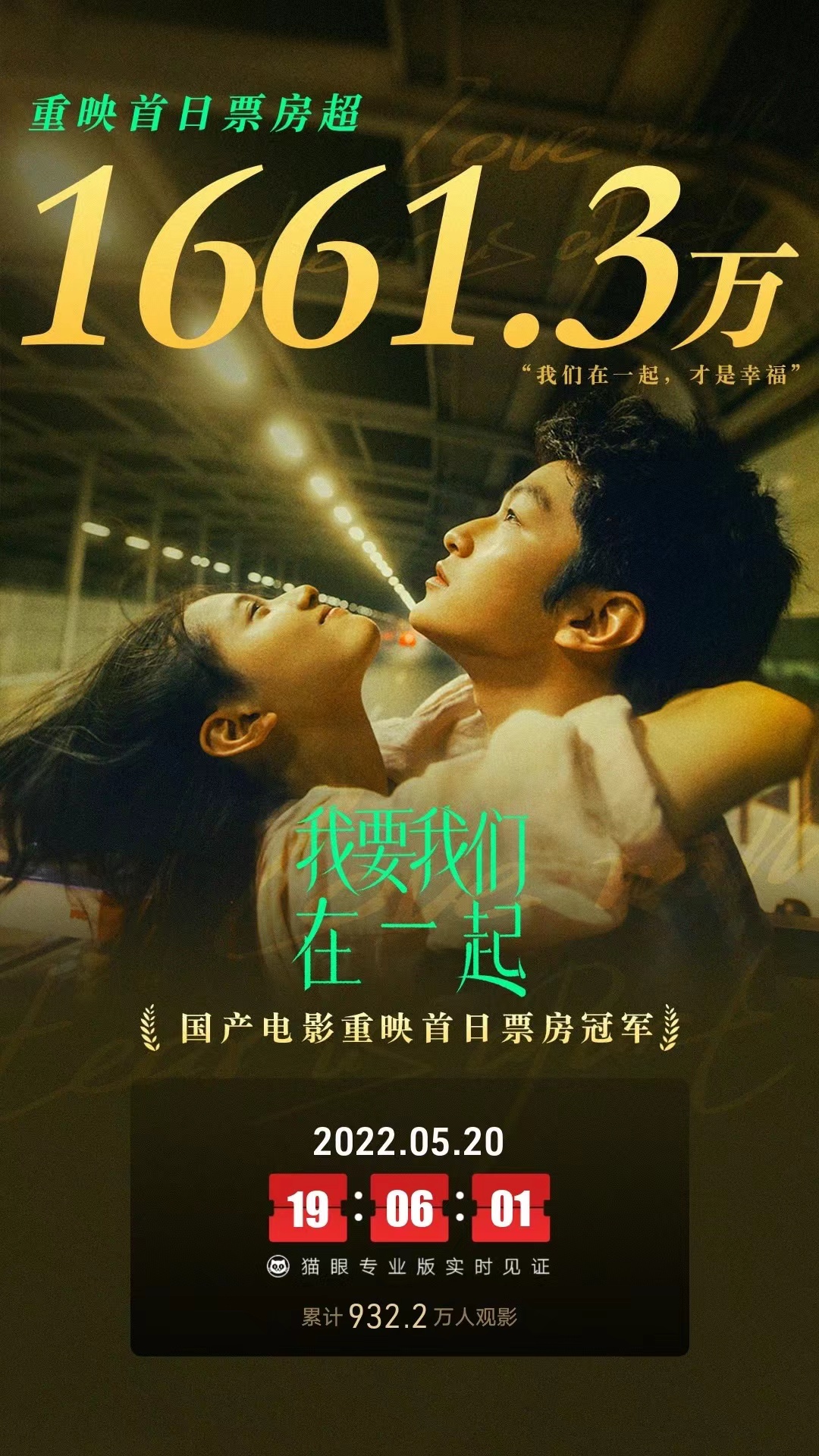 5月20日,由张婧仪主演的电影《我要我们在一起》时隔一年再度登陆院线重映,即2022年5月20日13时14分重映,上映当天票房破千万,成为当日院线票房中的黑马。该片根据李海波的网络长帖《与我十年长跑的