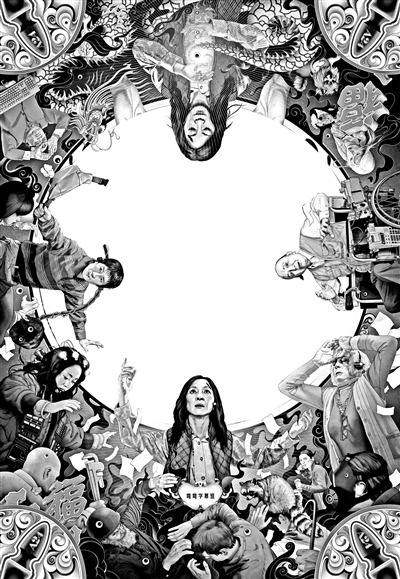 多元宇宙的概念不新鲜,但能把它玩得如此剑走偏锋、花样迭出的,当属少见。各种新奇脑洞、快速剪辑、夸张造型与低俗恶搞,使得影片呈现出独特的奇幻邪典喜剧风。与此同时,《瞬息全宇宙》还是一部迷影电影。从成龙式的功夫片、王家卫式的爱情片,到《黑客帝国》《太空漫游2001》《料理鼠王》《功夫》等,导演在脑洞大开的同时不忘疯狂致敬,在多元宇宙里卖弄着娴熟的中外电影史知识。