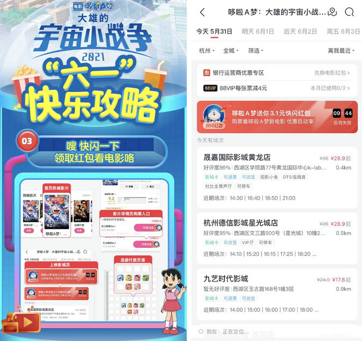 5月31日,淘票票快闪红包产品正式上线。通过快闪红包,电影主创可为观影用户精准提供暖心福利优惠。以影片《哆啦A梦:大雄的宇宙小战争2021》为例,童年回忆哆啦A梦作为影片代表,在淘票票端内为用户送上“快闪红包”,领取红包的用户可在10分钟内享受红包福利,以更优惠的价格达成购票。