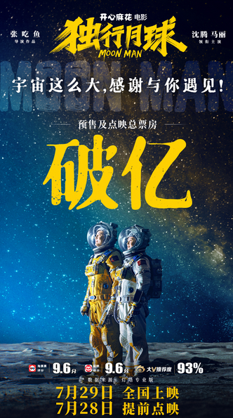 “对《独行月球》的期待特别高,看完片后的结论,就是沈腾马丽永远不会让人失望,超出期待的惊喜!”昨日,由张吃鱼执导,沈腾、马丽主演,将于7月29日上映的开心麻花科幻喜剧《独行月球》,在全国25个城市开启8756个场次的点映,在猫眼、淘票票双平台均拿到9.6的高分,预售及点映总票房破亿。这部备受期待的暑期档电影,点映座无虚席。看过片后,观众的好评,隔着屏幕都能感受到激动和热情,“超好看、放心冲、强烈推荐”等成为高频评论。有观众直言,“对这部电影已经很期待了,但还是超出了预期,喜剧的地方全都在笑,感动的地方真心感动,情绪起起伏伏,跟着笑笑哭哭”。