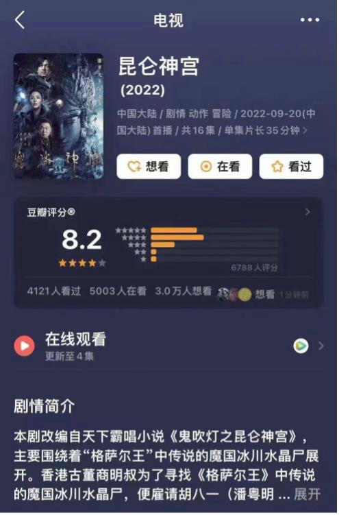 10月28日,由管虎监制、蔡岳勋担任总导演,潘粤明、张雨绮、姜超主演,根据天下霸唱同名小说改编的硬核探险网络剧《昆仑神宫》收官,该剧播出期间热度居高不下,豆瓣开分8.2,潘粤明继《龙岭迷窟》《云南虫谷》后三度出演胡八一,演技、适配度双获赞。