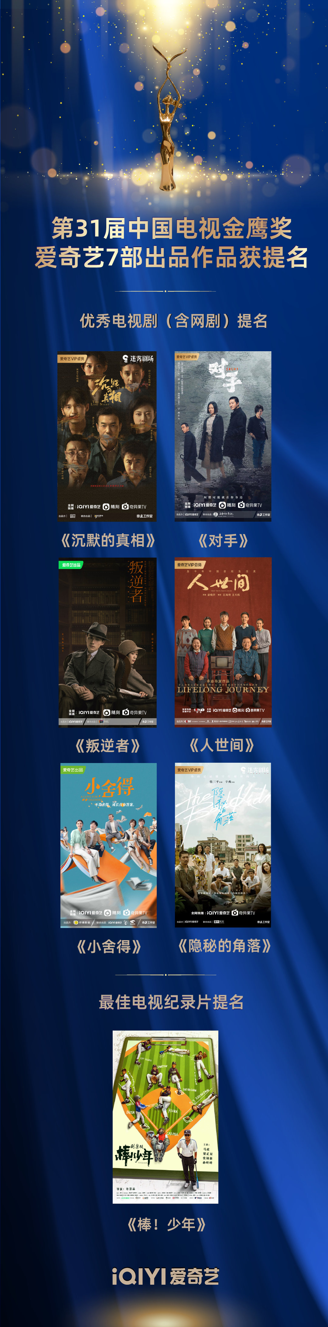 11月2日,第31届中国电视“金鹰奖”公布提名名单,爱奇艺7部作品入围。其中爱奇艺出品并网络独播的6部剧集《沉默的真相》《对手》《叛逆者》《人世间》《小舍得》《隐秘的角落》提名“优秀电视剧”,《棒!少年》提名“最佳电视纪录片”。本届“金鹰奖”最终花落谁家将于11月6日公布。